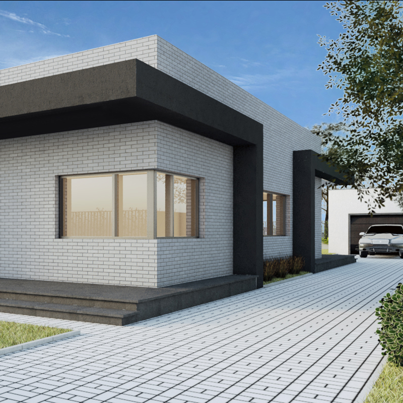 To parterowy dom jednorodzinny z garażem zlokalizowany na bardzo wąskiej działce w świetnej lokalizacji na włocławskim Michelinie. Ze względu na kształt działki, szyty na miarę. Prosta forma, przenikanie brył i kontrastowe materiały elewacyjne pozwoliły uzyskać nowoczesny i dynamiczny charakter.