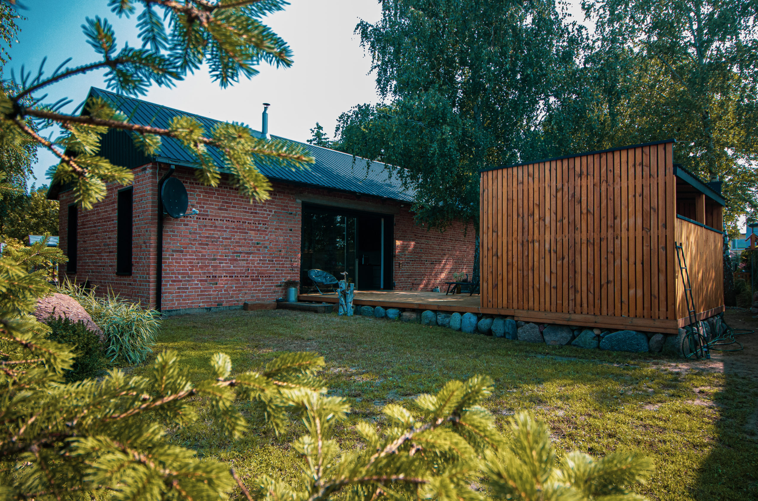 Podstawową bryłę uzupełniono drewnianymi boxami posiadającymi funkcje dodatkowej garderoby, ganku oraz kuchni letniej, połączonej z budynkiem tarasem.